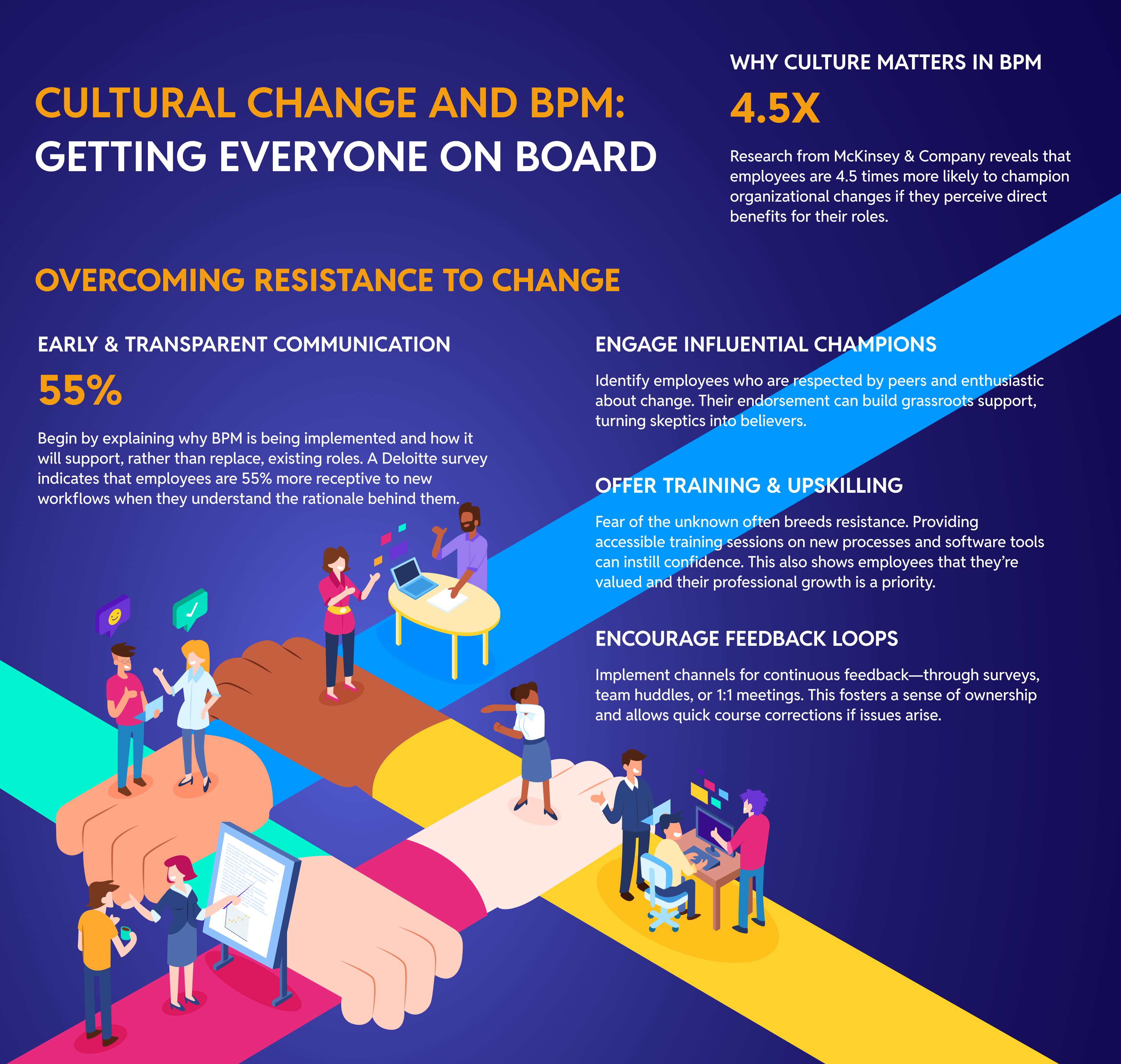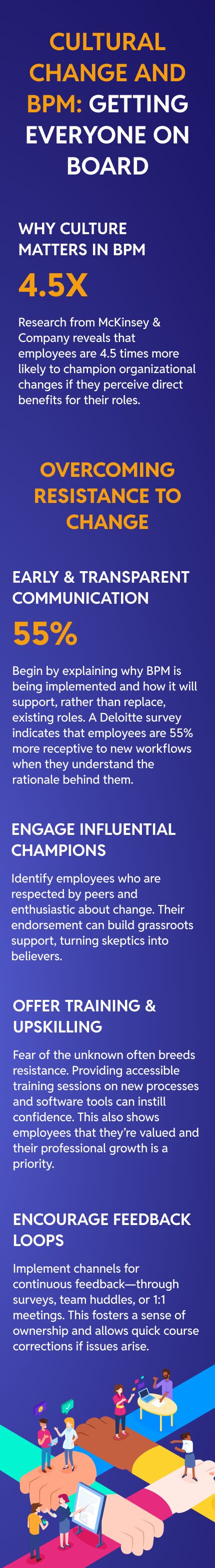 Begin by explaining why BPM is being implemented and how it will support, rather than replace, existing roles. A Deloitte survey indicates that employees are 55% more receptive to new workflows when they understand the rationale behind them³.