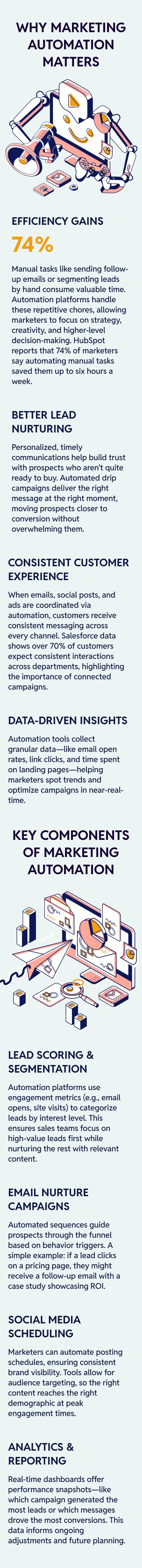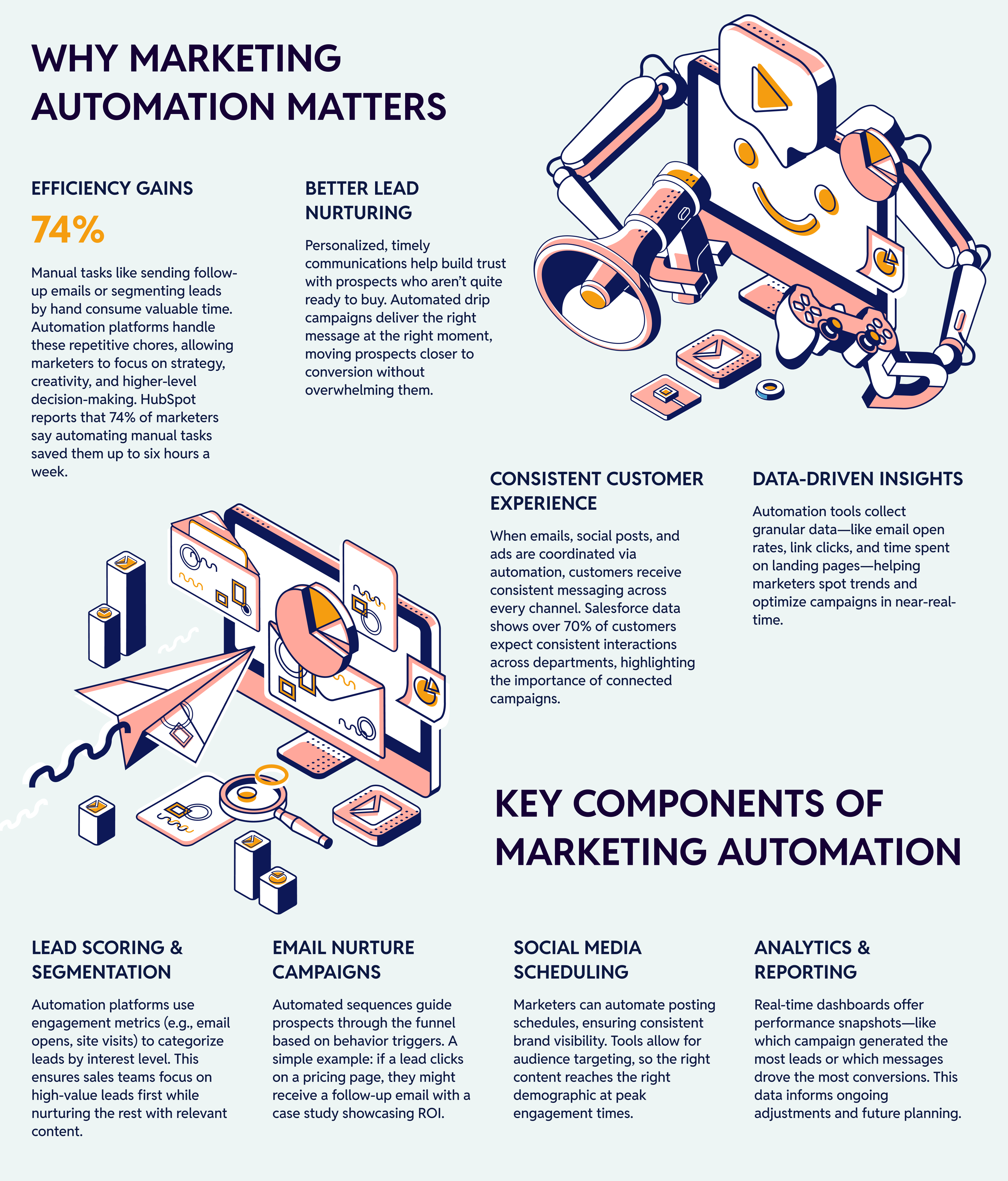Manual tasks like sending follow-up emails or segmenting leads by hand consume valuable time. Automation platforms handle these repetitive chores, allowing marketers to focus on strategy, creativity, and higher-level decision-making. HubSpot reports that 74% of marketers say automating manual tasks saved them up to six hours a week².